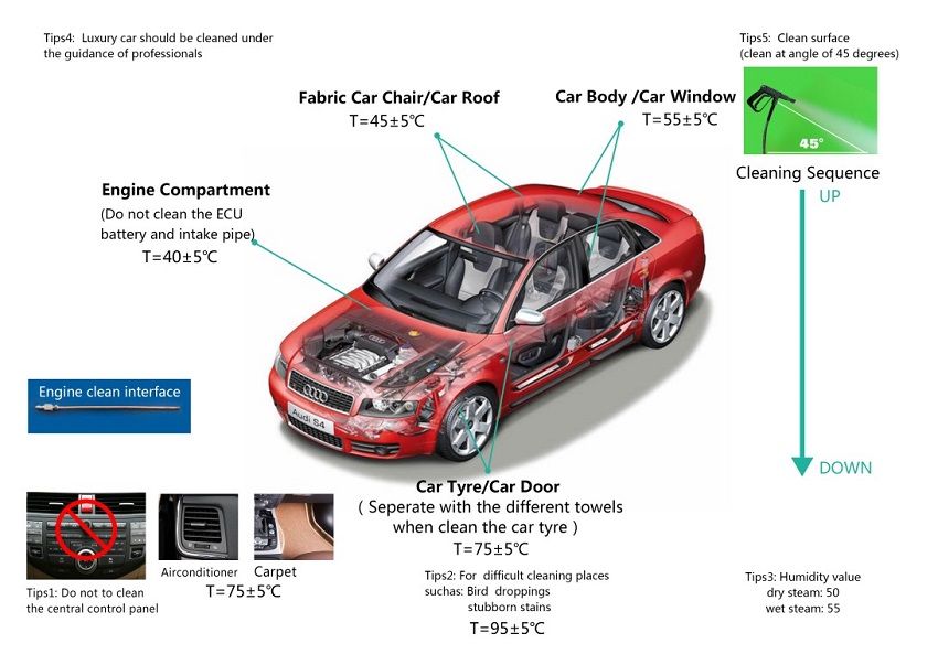 Сухая и влажная регулировка часто используется при мытье автомобилей. Сухой пар используется для очистки двигателя и салона автомобиля, что аналогично местам, которые не могут встретиться с водой. Влажный пар используется для очистки внешнего вида грязного автомобиля. Клиенты пароочистителя GOCLEAN могут приспособиться только в процессе мойки автомобилей, если они владеют методами регулировки.
