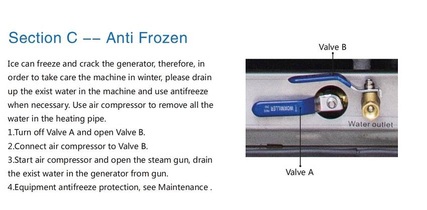 Наконец, обратите внимание на борьбу с замораживанием, эту проблему легко упустить из виду, особенно для пользователей в некоторых странах Европы. Очень холодно в победителе, некоторые пользователи думают, что внутренняя температура оборудования для очистки пара высока, и оно не замерзнет, но они не знают, не опорожняет ли внутренний резервуар для воды воду, когда он не используется ночью, трубы и резервуары для воды треснут из-за замерзания. Чтобы предотвратить замерзание, существует два способа: один — поместить автомобильную шайбу в теплое помещение, а другой — сделать воду внутри машины пустой.